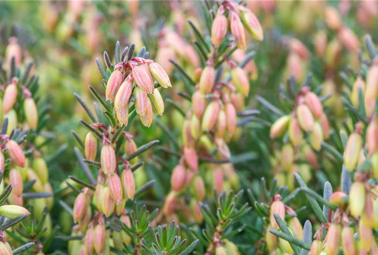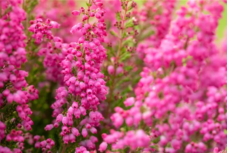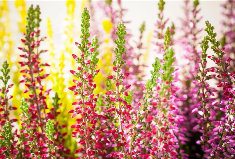 Besenheide oder Heidekraut ist nicht die einzige Heideart und gerade im Zusammenspiel mit anderen Heide gewinnt Heide im Herbst ihren ganz besonderen Charme. Die Familie der Heidegewächse umfasst Hunderte von Arten. Die bekannteste davon dürfte neben der Besenheide die Glocken- oder Moorheide, im Volksmund nach ihrem botanischen Namen Erika genannt, sein. Sie hat, wie alle Erika-Arten, glockenförmige Blüten, die bereits im Juli beginnen, zu blühen. Schneeheide dagegen blüht vom Dezember bis in den April hinein. Gerade bei ihr ist es wichtig, dass sie auch im Winter regelmäßig Wasser bekommt, denn sie sollte niemals austrocknen. Eine weitere bekannte Heide-Art ist die Knospenheide. Ihre Knospen öffnen sich nicht zur Blüte, sodass sie auch nicht verblühen kann und daher bis tief in den Winter hinein blüht.