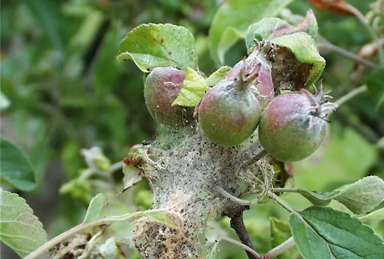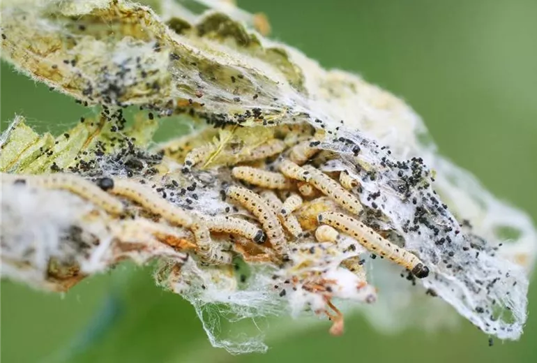 Die Apfelbaumgespinstmotte (Yponomeuta malinella) ist ein kleiner, heller Falter von ca. einem Zentimeter Länge. Die weißen Flügel sind auffällig schwarz gepunktet. Nach vollendeter Larvenentwicklung verpuppen sich die Tiere innerhalb des Gespinstes.