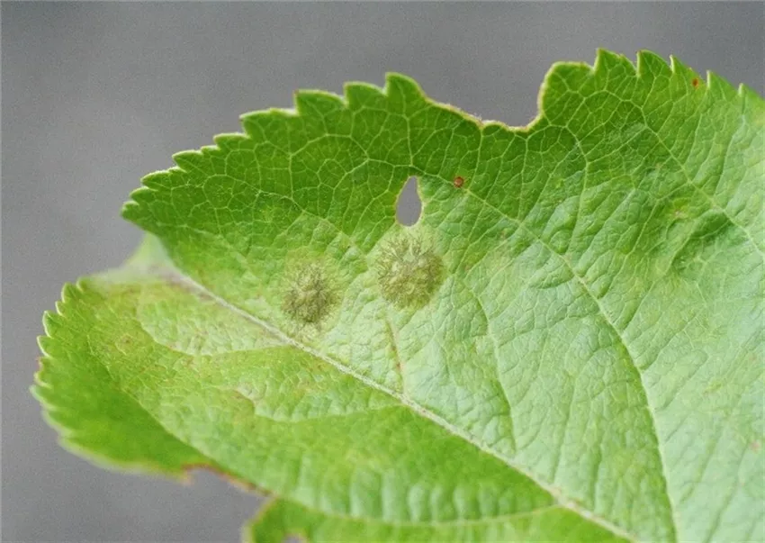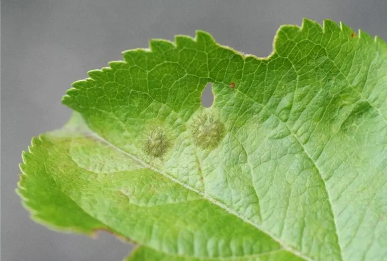 Auf den Früchten entstehen anfangs kleine, runde, dunkle Flecke, die sich später ausdehnen können. Bei starkem Befall reißt die Fruchtschale schorfig auf. Auf den Blättern bilden sich graubraune Flecken mit samtigem Aussehen. Ein ähnliches Schadbild verursacht die Rußfleckenkrankheit.