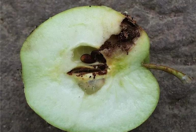 Die aus den Eiern schlüpfenden Larven (Räupchen) bohren sich alsbald in die Frucht ein.