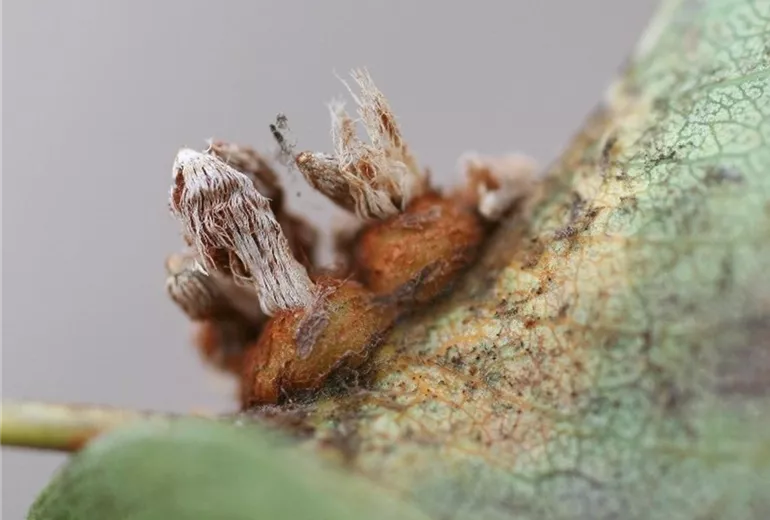 Auf den Blättern der Birne bilden sich zuerst kleine, gelbe, dann größere, leuchtend-orange Flecke. Im Spätsommer und Herbst entwickeln sich an diesen Stellen blattunterseits höckerähnliche Gebilde (Sporenlager).