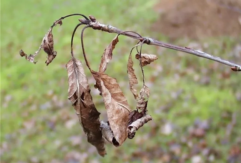 Die Blattbräune wird durch einen Pilz verursacht. Vor allem in regenreichen Frühjahren kann es zu stärkerem Befall kommen. Auf den abgestorbenen Blättern des Vorjahres bilden sich im Frühjahr Pilzsporen, die bei feuchter Witterung das junge Laub infizieren.