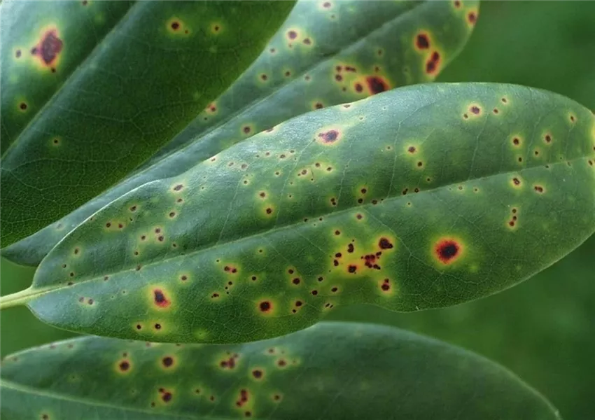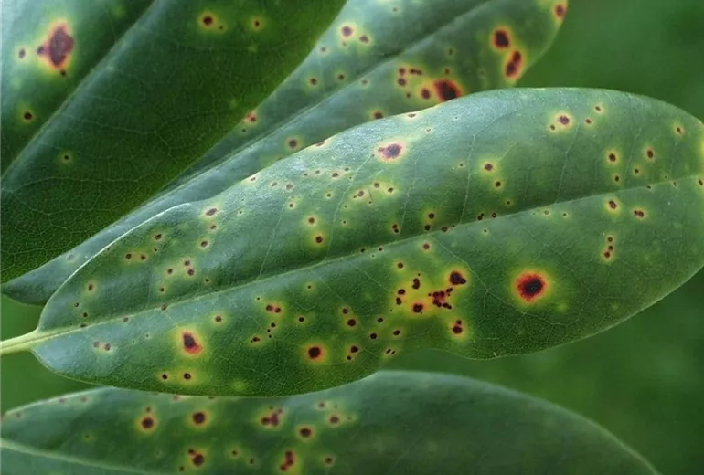 Blattflecken an Rhododendren können verschiedene Ursachen haben. Neben Frostschäden und Verbrennungen durch Sonneneinstrahlung treten auch pilzliche Blattfleckenerreger auf. In Zweifelsfällen können die Pflanzenschutzberatungsstellen weiterhelfen.
