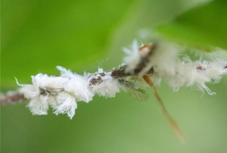 An Blättern und jungen Trieben sitzen im Frühjahr Blattläuse, die mit Wachswolle umhüllt sind. Die Blätter sind stark durch klebrigen Honigtau verschmutzt, der im Laufe der Zeit von schwarzen Rußtaupilzen besiedelt wird.