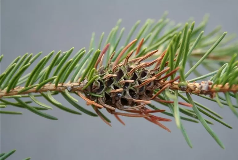 4. Ananasförmige Gallen an den Trieben der Rotfichte (Picea abies). Im Frühjahr kann man an den jungen Trieben die nach grünen Gallen erkennen