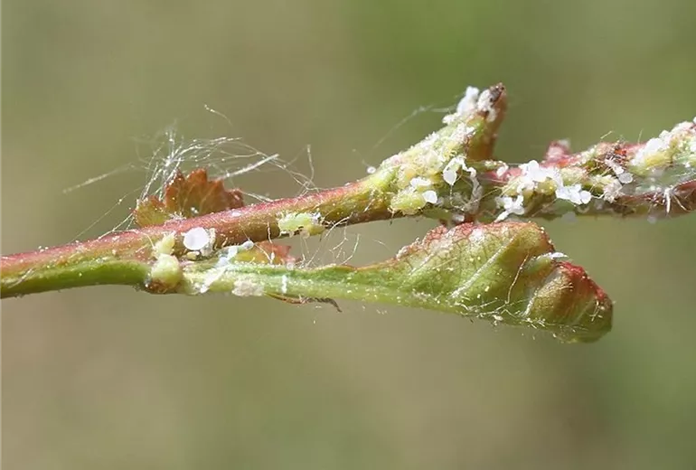 Durch die Saugtätigkeit kann es zu rötlichen Verfärbungen der Blätter kommen. Bei starkem Befall sterben die jungen Blättchen auch teilweise ab.