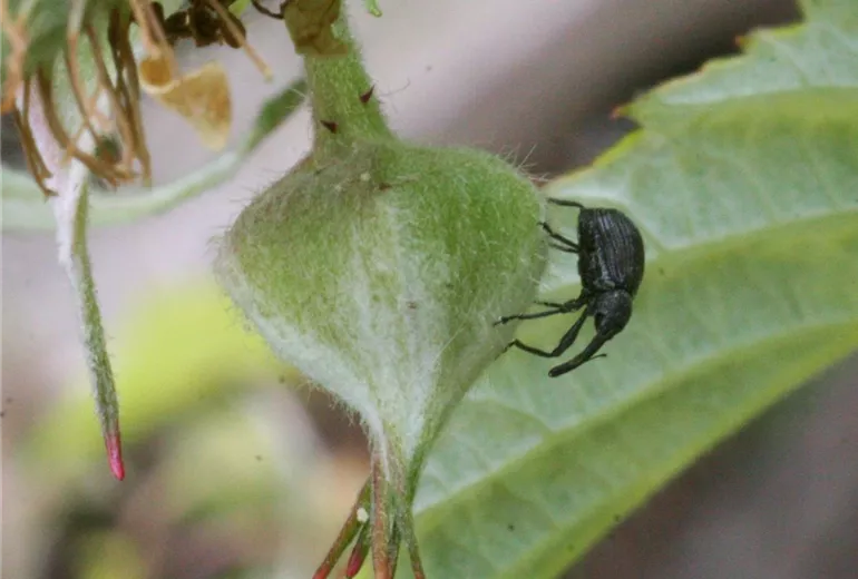 Der Blütenstecher (Anthonomus rubi) ist ein kleiner Rüsselkäfer, der seine Eier in die Blütenknospen von Erdbeeren, Brom- und Himbeeren legt, wo sich die weißlichen Larven entwickeln.