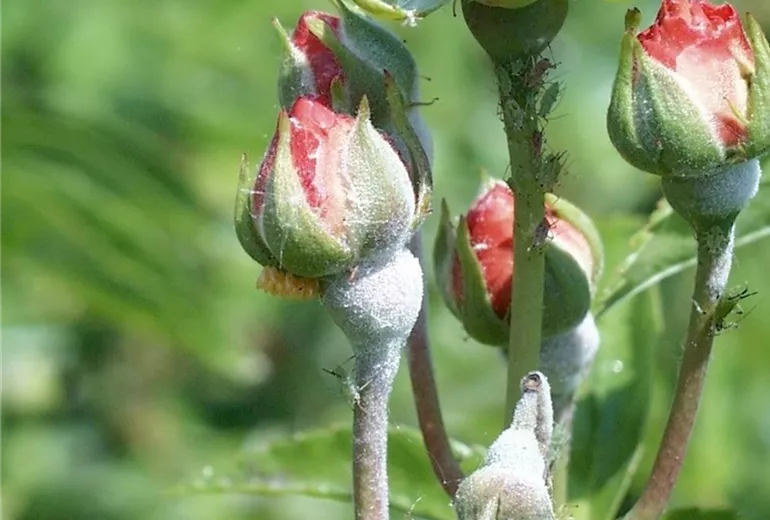 Der Echte Rosenmehltaupilz (Sphaerotheca pannosa) befällt häufig schon Anfang Mai die jungen Rosentriebe und Blätter. Er überwintert unter Knospenschuppen aber auch auf Trieben.