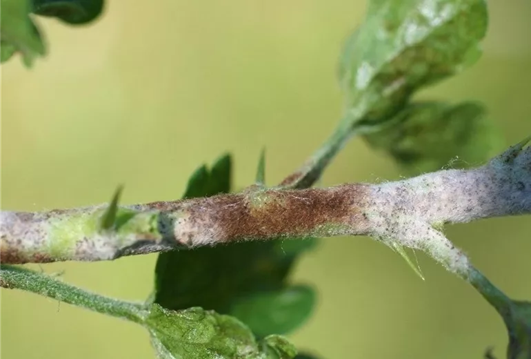 Der Pilz (Sphaerotheca mors-uvae) überwintert auf den Trieben.