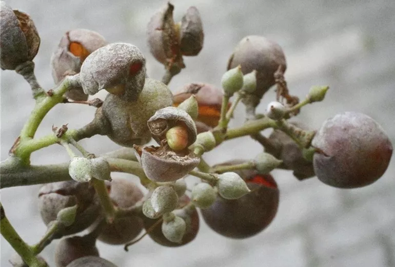 Auf den jungen, meist erbsengroßen Früchten sind die Schadsymptome meist deutlicher zu erkennen. Die Früchte verhärten, werden grau oder schwarz und platzen auf, so dass die Kerne frei liegen.