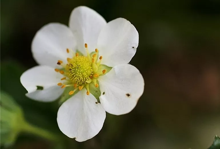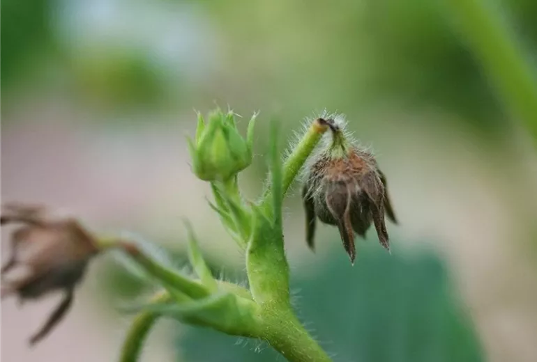 Bei Befall mit dem Erdbeerblütenstecher (Coenorrhinus germanicus) zeigt die Blütenknospe ein winziges Loch. Unterhalb der Blüte ist der Blütenstiel angefressen. Er knickt an dieser Stelle ab und die Blütenknospe vertrocknet.