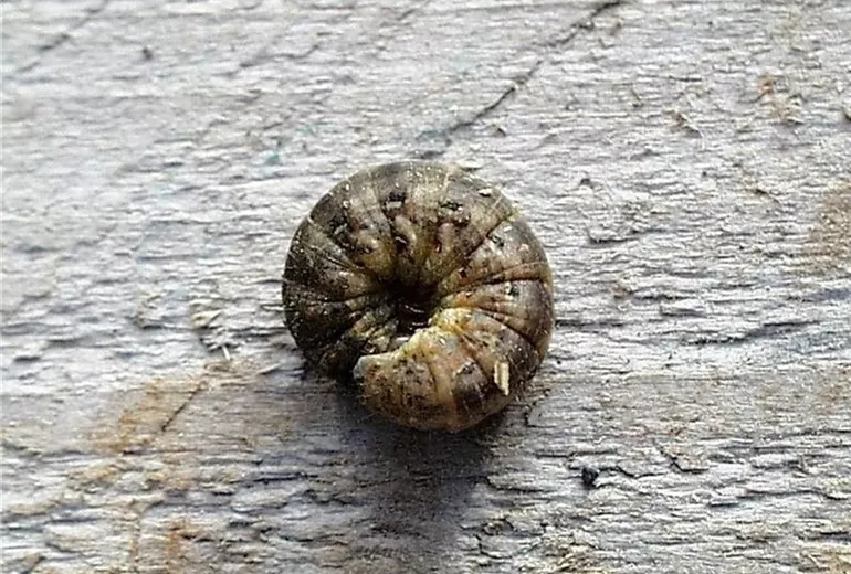 Im Wurzelbereich geschädigter Pflanzen findet man in der Erde bis zu 5 cm lange, graubraune oder graugrüne, plumpe Larven, die sich bei Berührung auffällig zusammenrollen.