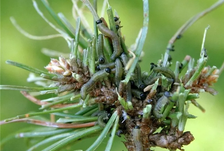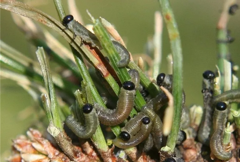 An Kiefern verursachen verschiedene Blattwespenarten Nadelfraß: Die Kiefernbuschhornblattwespe, die rot-gelbe Buschhornblattwespe und die Kiefernkulturgespinstblattwespe.