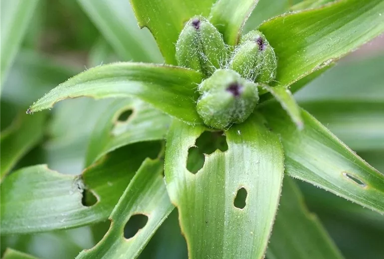 An Stauden und Sommerblumen sind Fraßschäden durch Schmettlingsraupen, Blattwespenlarven oder Blattkäfer eher selten.