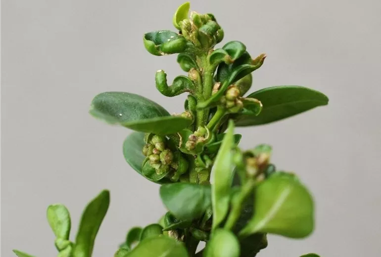 Die jungen Triebe sind an der Spitze gestaucht, die Blätter deformiert.