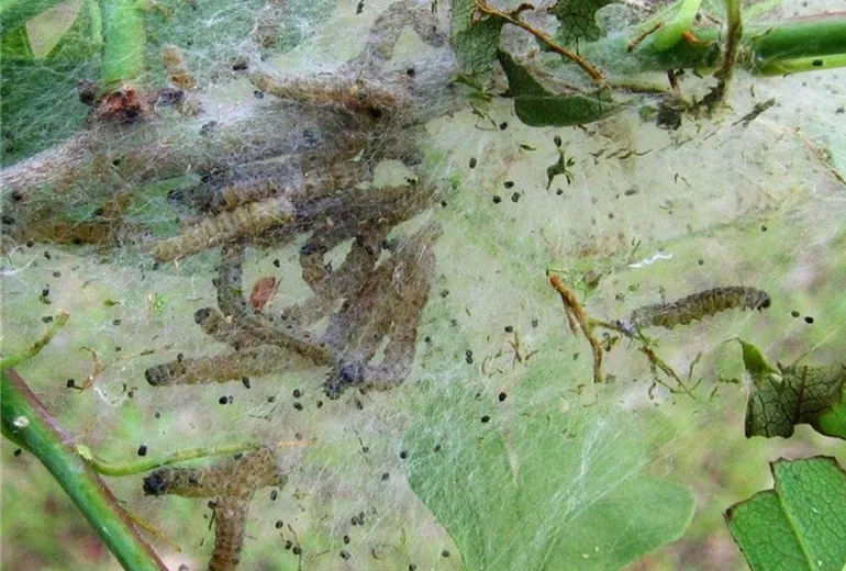 Im Mai und Juni bilden hellgraue oder cremefarbene Larven auffällige Gespinste zwischen kahlgefressenen Zweigen.