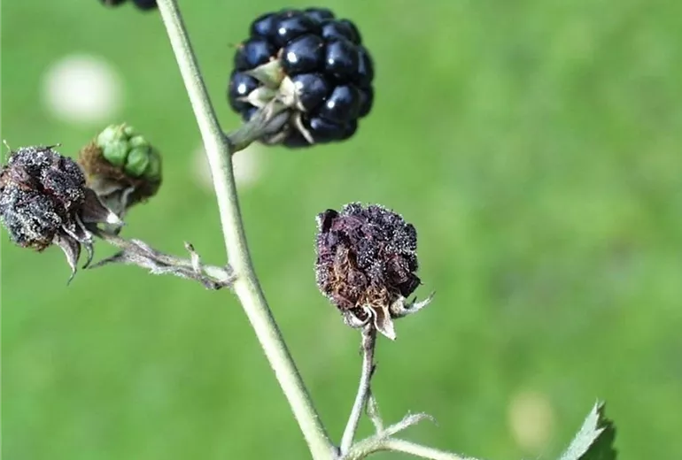 Reifende Früchte beginnen zu faulen und zeigen einen grauen Schimmelrasen. Junge, noch unreife Früchte vertrocknen.