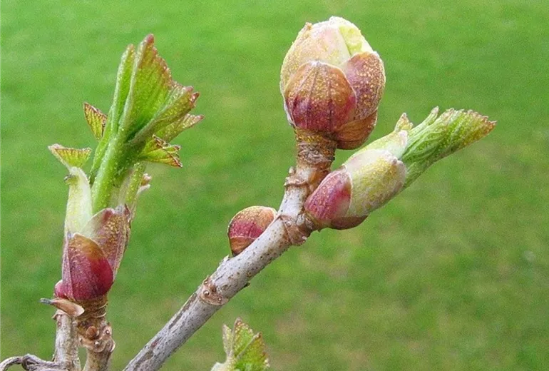 In unbelaubtem Zustand sind an den Trieben der Schwarzen Johannisbeere kugelig angeschwollene Knospen zu sehen. Im Frühjahr treiben diese befallenen Rundknospen nicht oder nur schlecht aus.