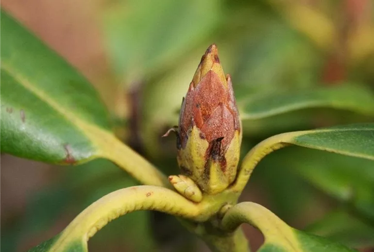 Im Laufe des Winters verbräunen die Knospen der immergrünen großblumigen Rhododendren und sterben ab, so dass sie im folgenden Frühjahr nicht austreiben.