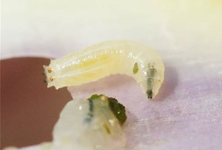 Außer dem Wurzelfraß kommt es vor allem im Hoch und Spätsommer an Chinakohl, aber auch an Kopf, Blumen und Rosenkohl zu oberirdischem Befall in Form von Fraßgängen in Blattrippen und Röschen.