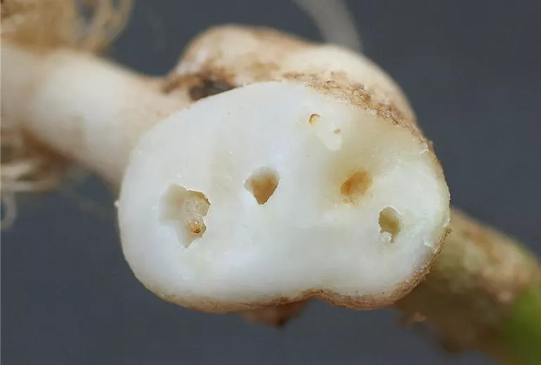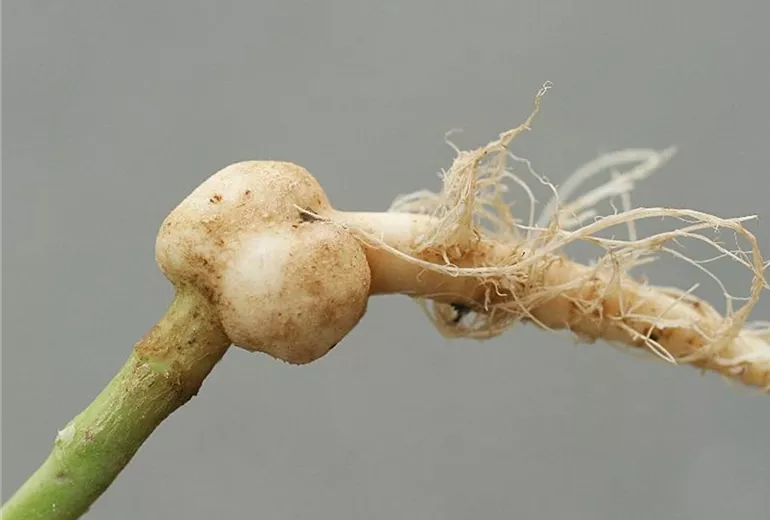 Am Wurzelhals oder direkt an der Hauptwurzel befinden sich kugelige, erbsen bis haselnussgroße Wucherungen (Gallen). Bei Kohlrabi können diese Gallen gelegentlich auch im unteren Knollenbereich auftreten.