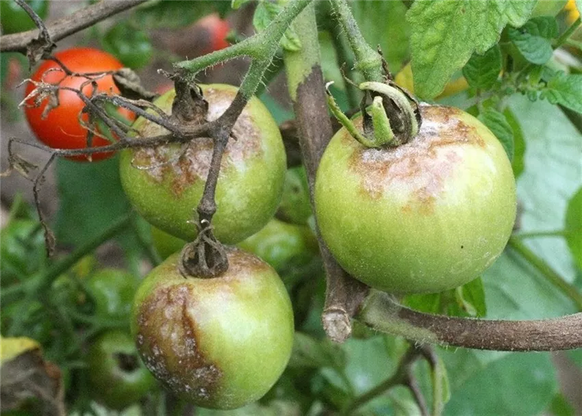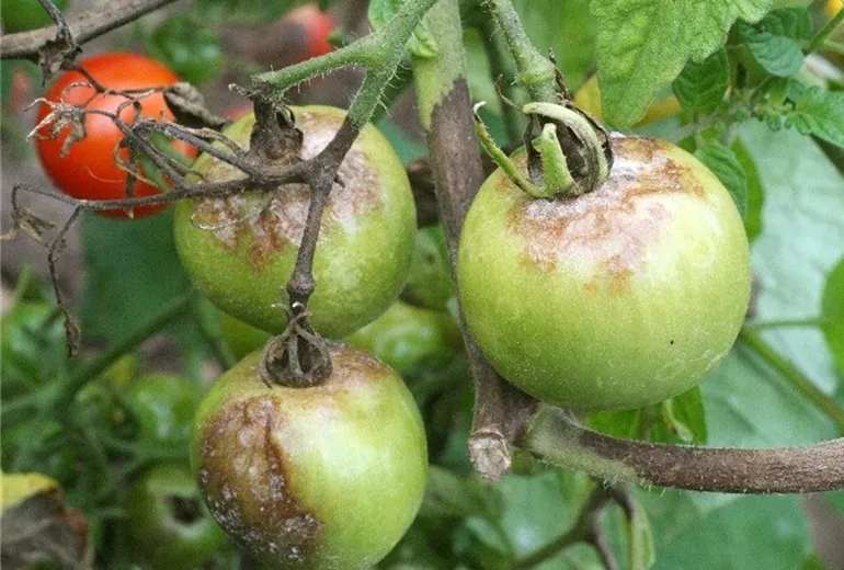 Die Kraut und Braunfäule der Tomate wird vom gleichen Pilz (Phytophthora infestans) verursacht wie die Kraut und Knollenfäule der Kartoffel. Da der Pilz auf Feuchtigkeit angewiesen ist, kommt es vor allem in regenreichen Sommern oder zum Ende der Kulturzeit im September zu Infektionen.