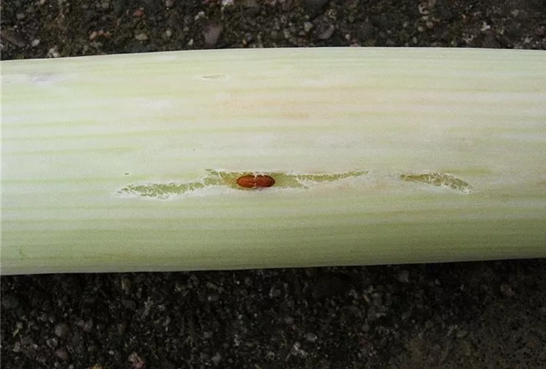 Vor allem bei Winterlauch fallen zur Ernte Fraßgänge auf, die von oben zur Basis hin verlaufen. Zum Teil können diese Miniergänge aufplatzen. Durch die Beschädigung des Schaftes kommt es häufig zu Fäulen.
