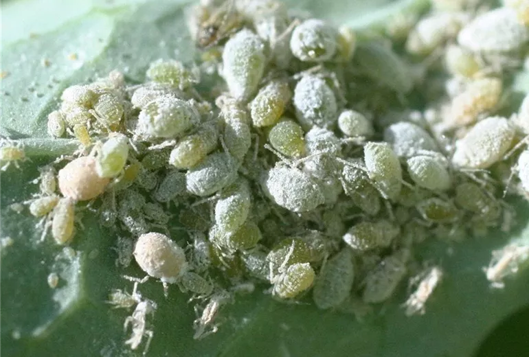 Die Mehlige Kohlblattlaus (Brevicoryne brassicae) schädigt vor allem in warmen, trockenen Sommern. Im Herbst legen die Tiere ihre anfänglich grünlichen, später glänzend schwarzen Eier an Raps und Unkräutern aus der Familie der Kreuzblütler oder auch an Grün und Rosenkohl ab. Hier überdauern sie den Winter.