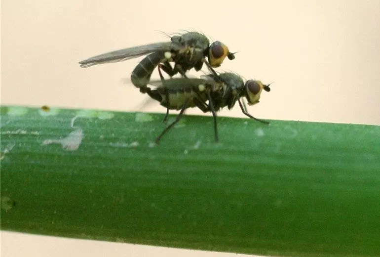 Die sehr kleinen und unscheinbaren Minierfliegen legen ihre Eier in die Blätter. Die daraus schlüpfenden Larven legen Fraßgänge im Blatt an.