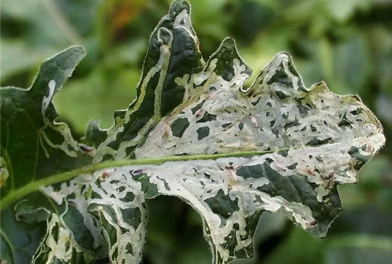 In den Blättern befinden sich Fraßgänge, in denen sich die winzigen Larven des Schädlings aufhalten. Besonders häufig und stark werden Strauchmargeriten (Argyranthemum frutescens) befallen.