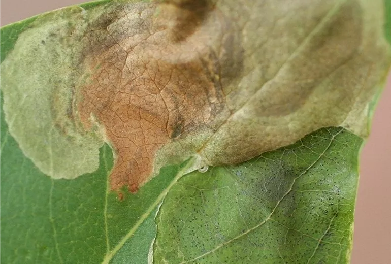 Die Blätter zeigen anfänglich olivgraue Flecken. Die Blatthaut ist über dem zerstörten Blattgewebe sichtbar und man kann Kotkrümel erkennen. Im Blatt frisst eine unscheinbare gelbliche Larve.