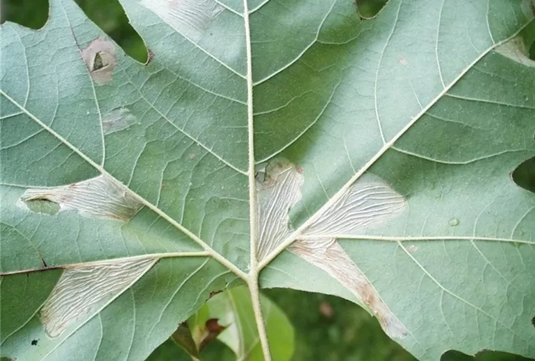 Auf der Blattoberseite bilden sich kleine gesprenkelte Flecken. An diesen Stellen ist auf der Blattunterseite zu erkennen, dass es sich um so genannte Platzminen handelt, in den die Räupchen fressen.
