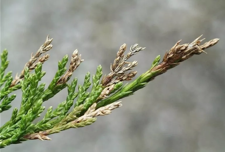 Die Triebspitzen von Wacholder (Juniperus) sind braun verfärbt. Besonders auffällig sind die Schäden an Juniperus virginiana 'Sky Rocket'.