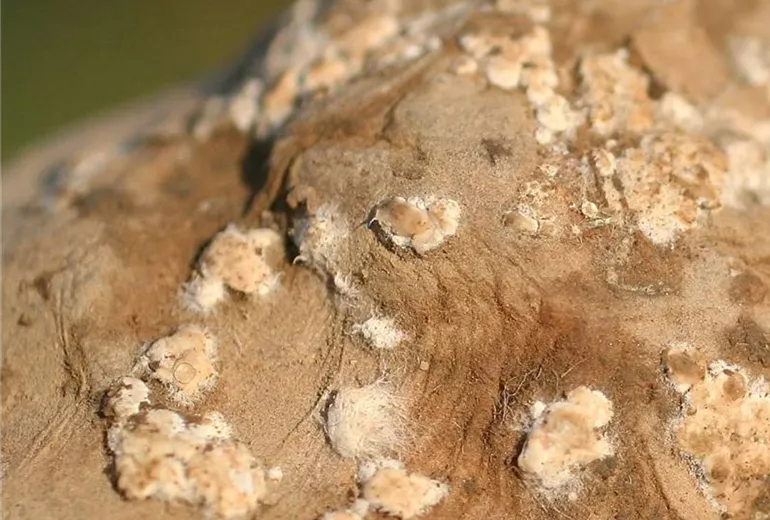 Bei den Trockenfäulen sinkt das Knollengebewebe ein und oftmal bildet sich auf der Schale Pilzgewebe mit Sporen. Ein typischer Vertreter ist die Fusarium Trockenfäule, die auch als Weißfäule bezeichnet wird.