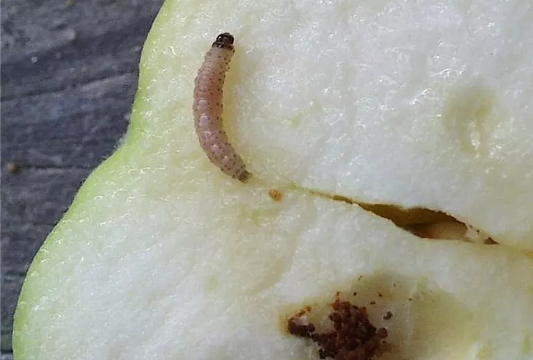 In ihnen lebt die blassfleischfarbene "Obstmade". Sie kann bis zu 20 mm lang werden. Es handelt sich dabei um die Larve des Apfelwicklers, eines unscheinbaren Kleinschmetterlings.