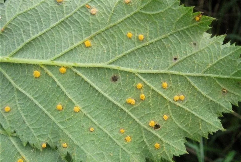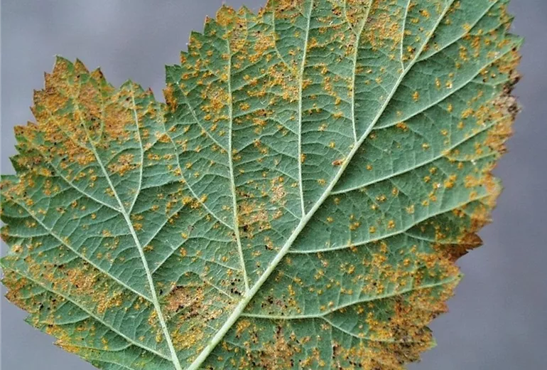 Auf den Blattoberseiten entstehen Flecken auf deren Unterseite sich anfangs orangene später grau-schwarze Sporenlager bilden.