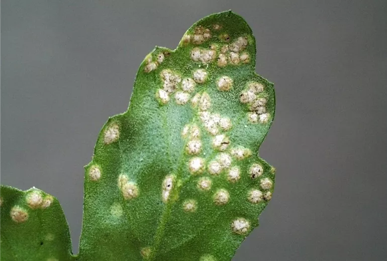 Auf Blättern und Stängeln bilden sich Pusteln oder auch Sporenbeläge, deren Farbe von cremeweiß über rosa, gelbe, orange, rot, braun bis schwarz gehen kann.