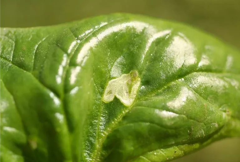 Die Blätter zeigen helle, unregelmäßige Flecke. An diesen Stellen fressen die Larven der Minierfliege Gänge ins Blattgewebe. Bei starkem Befall können die Blätter partiell absterben.