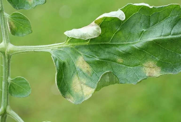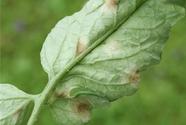 Auf den Blättern der Tomate entstehen gelbliche Flecke. Auf der Blattunterseite bildet sich an dieser Stelle ein brauner, samtartiger Pilzrasen.
