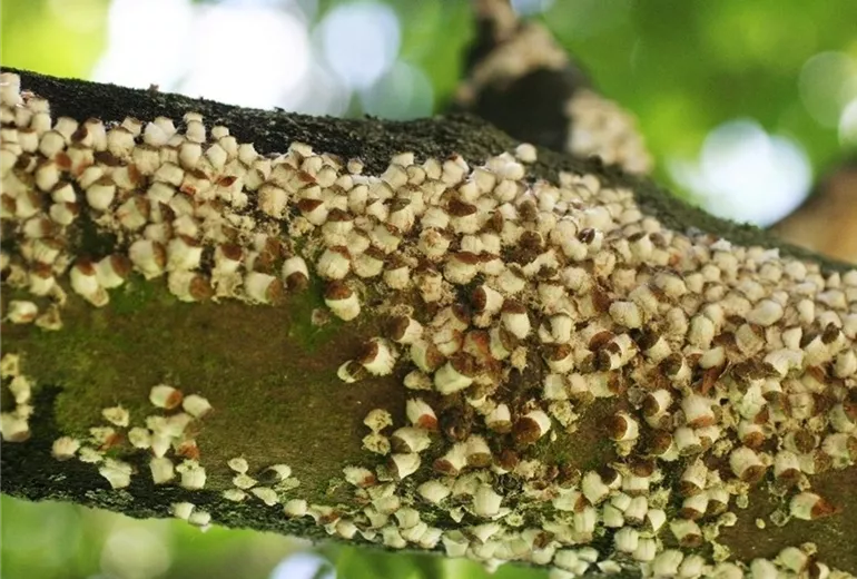 An Zweigen und Stamm sitzen große Schildläuse mit auffälliger Wachswolle. Die Wollige Napfschildlaus bereitet vor allem im trocken-warmen Stadtklima an Straßenbäumen Probleme.