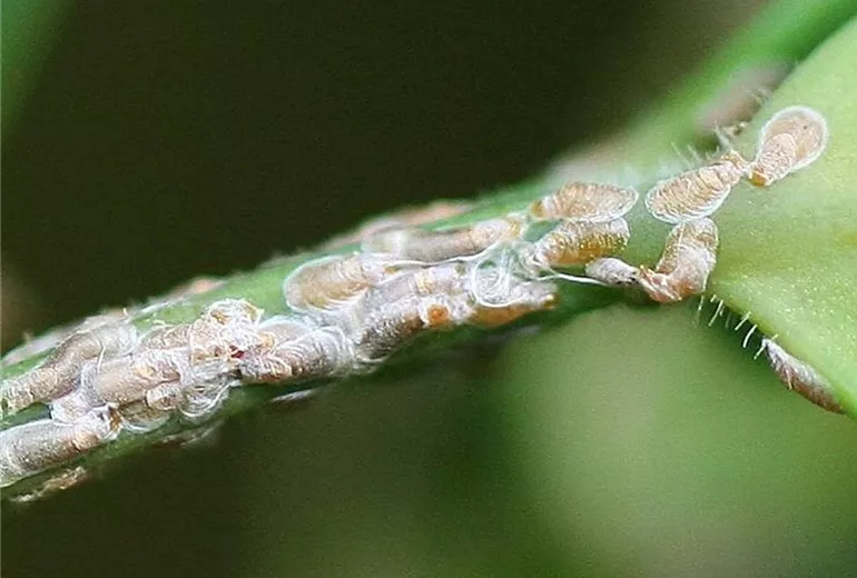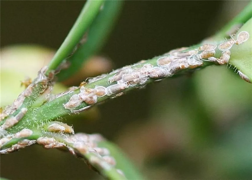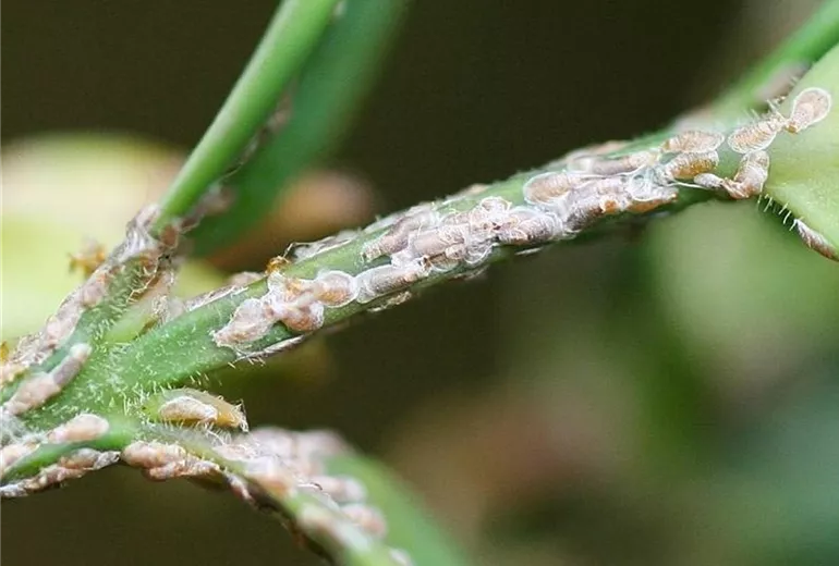 Blätter und ganze Triebe werden braun. An ihnen sind kleine, längliche dunkel gefärbte Schildläuse zu erkennen.