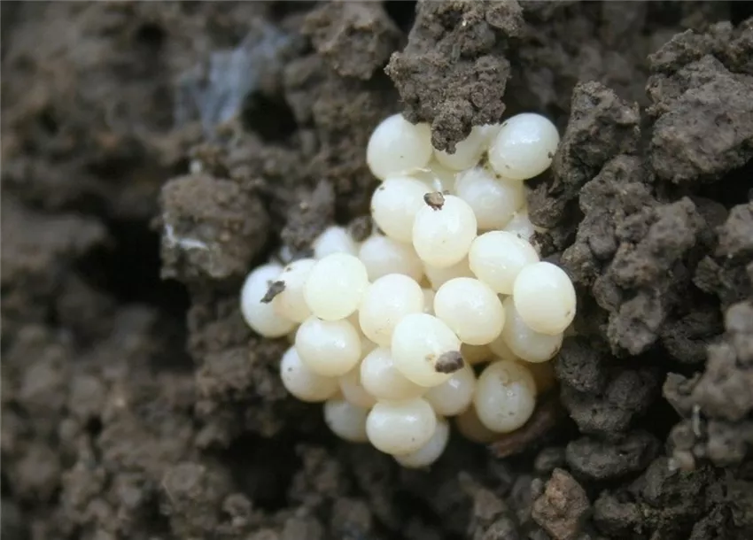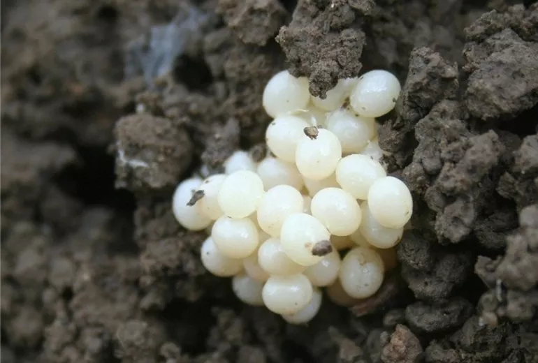 Die gut sichtbaren weißen oder grauen Eier werden in Klumpen im Boden abgelegt.