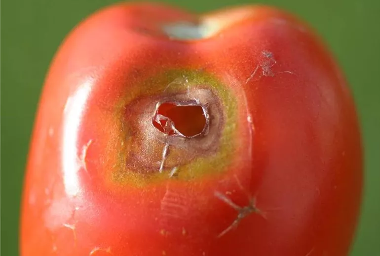 Die Blätter und Früchte der Tomaten zeigen Fraßspuren. Häufig sind auch die silbrigen Schleimspuren zu finden.