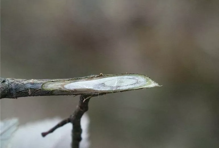 Schneidet man welkende Triebe schräg an, so sind die typisch graubraunen Verfärbungen im Bereich der Leitungsbahnen zu erkennen.