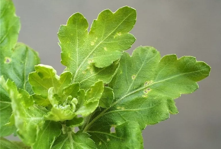 Jüngere Blätter sind deformiert. Sie erscheinen zerstochen oder löchrig.Bei starkem Befall können auch junge noch weiche Triebspitzen und Blüten geschädigt sein.
