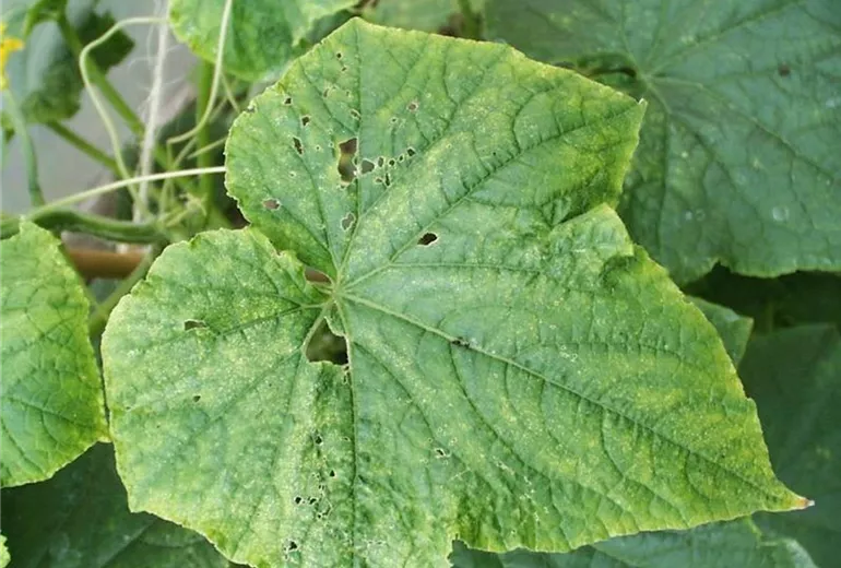 Die Blätter der Gurke sind eigenartig durchlöchert und meist auch verkrüppelt. Junge Blätter zeigen Einstiche. An den Blattstielen, den jungen Trieben und jungen Früchten sind auch Anstichstellen zu beobachten, an denen sich häufig kleine durchsichtige oder gelbliche Gummitröpfchen bilden.