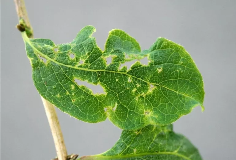Jüngere Blätter sind deformiert. Sie erscheinen zerstochen oder löchrig.