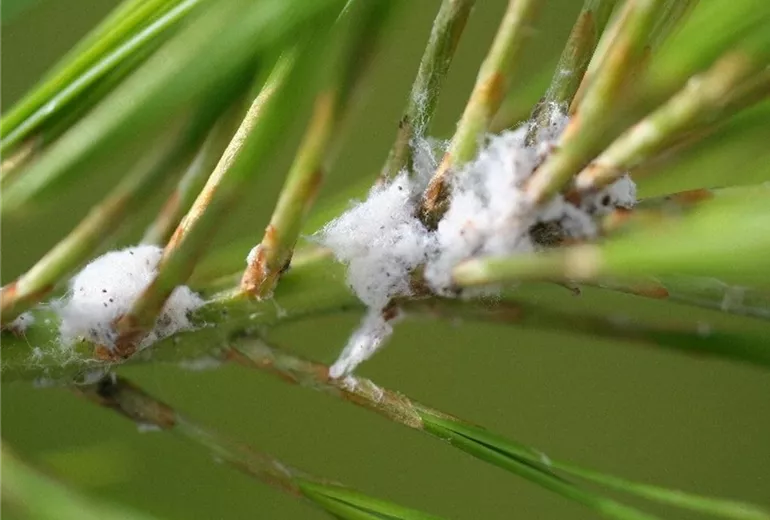An den Nadeln, vor allem der Nadelbasis, befinden sich graue oder gelb-braune Blattläuse, die von weißer Wachswolle umhüllt sind. Ein ähnliches Schadbild können Nadelschildläuse verursachen.