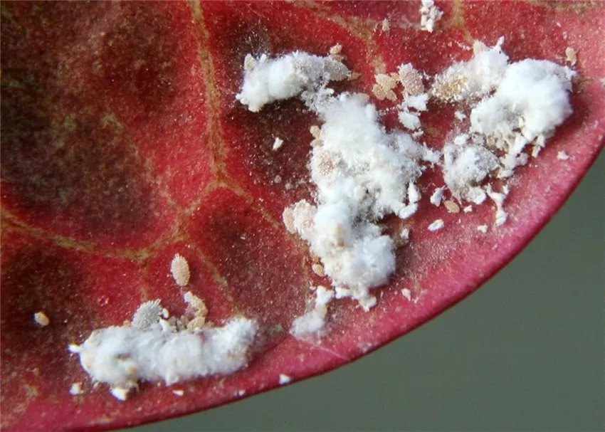 Auf Blättern und Trieben - bei Kakteen auch am Wurzelhals - sitzen in weißen Watteflocken die unscheinbaren cremefarbenen Schmierläuse.
