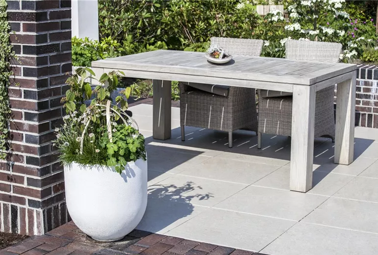 Wie groß die Terrassenfläche sein soll, hängt von der Nutzung und der Anzahl der Personen ab. Für die Größe des Essplatzes gelten folgende Richtwerte: Ein quadratischer Tisch (80 x 80 cm) mit vier Stühlen benötigt mindestens 10 qm Platz, ein rechteckiger Tisch (160 x 80 cm) mit sechs Stühlen ca. 13 qm und ein runder Tisch (Ø 120 cm) mit acht Stühlen ca. 16 qm. Beachte auch, dass hinter den Sitzenden mindestens 50 cm Platz sein sollte, damit man vorbeigehen kann. Sollen auch noch Liegestühle, Kübelpflanzen oder ein Grill platziert werden, muss entsprechend größer geplant werden.